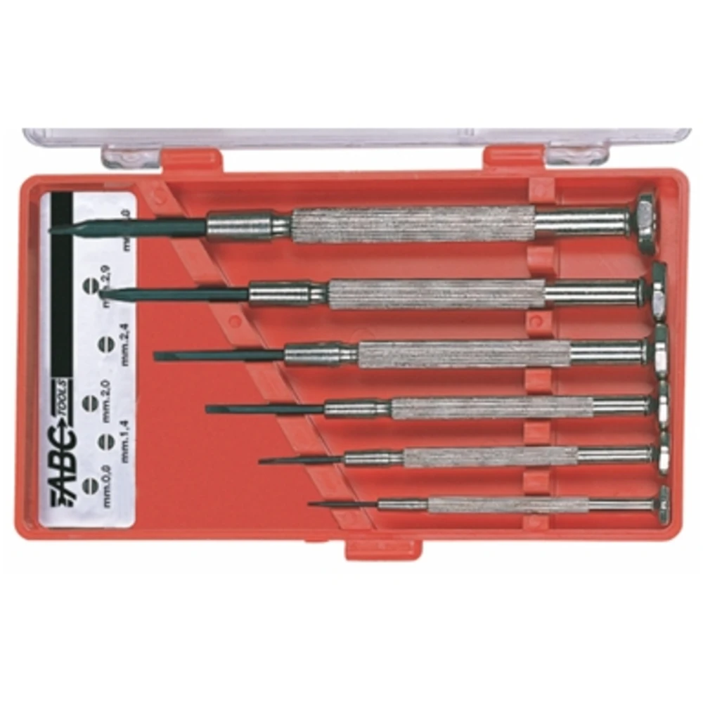 Adatti anche per meccanica fine, elettronica, ottica, ecc. Lama fissa in acciaio al cromo-vanadio, brunita Tipo con corpo in metallo Serie di 6 giraviti in astuccio di plastica trasparente 1 pezzo per tipo larghezza taglio mm 0,8 - 1,4 - 2 - 2,4 - 2,9 - 3,8