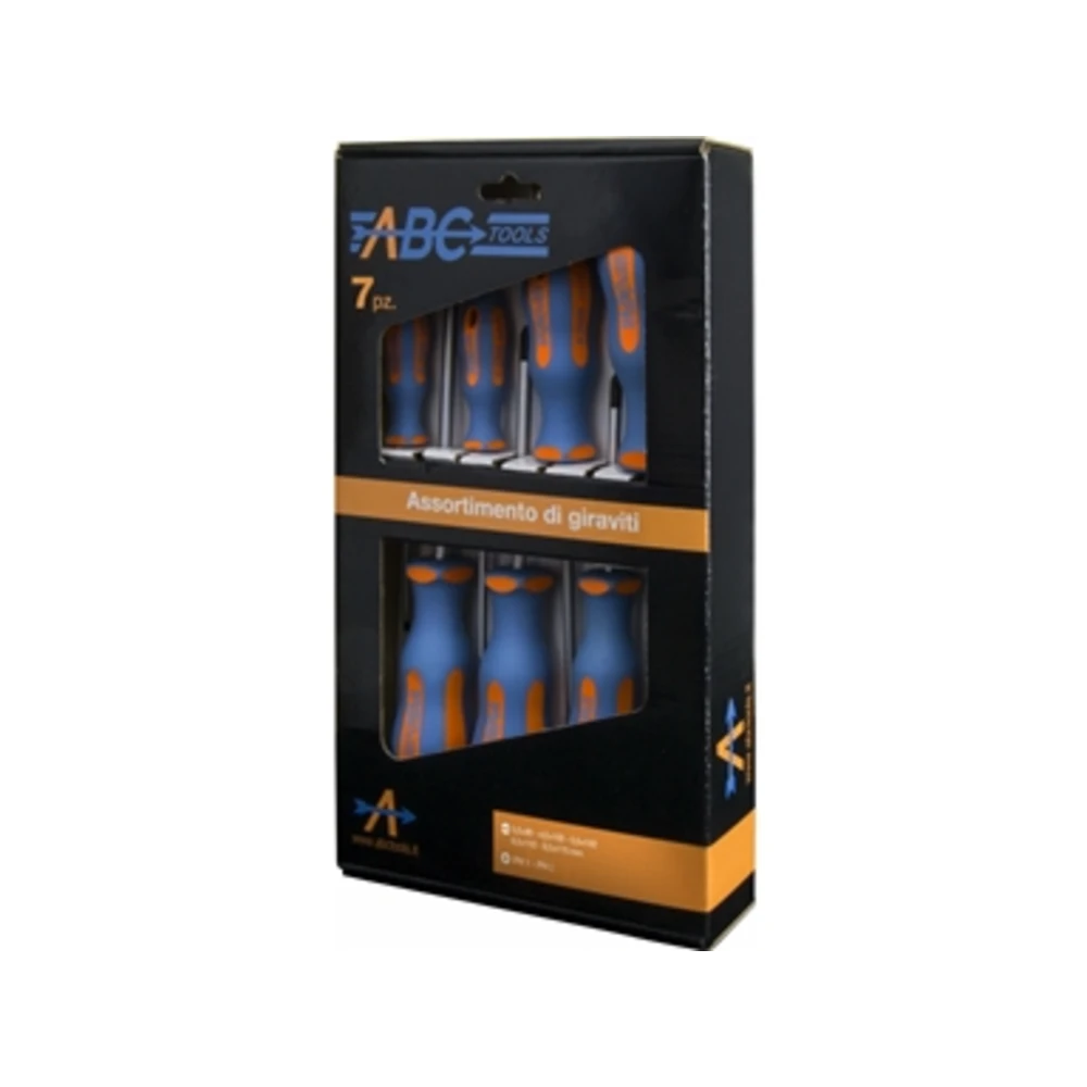 Con 7 giraviti 5 giraviti per viti con intaglio A 1436 mm 3,0x80 - 4,0x100 - 5,5x125 - 6,5x150 - 8,0x175 2 giraviti per viti a croce «PHILLIPS» A 1472 Punta DIN 1 - 2 In scatola di cartone con visualizzazione del contenuto