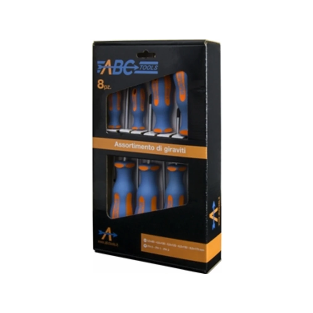 Con 8 giraviti 5 giraviti per viti con intaglio A 1436 mm 3,0x80 - 4,0x100 - 5,5x125 - 6,5x150 - 8,0x175 3 giraviti per viti a croce «PHILLIPS» A 1472 Punta DIN 0 - 1 - 2 In scatola di cartone con visualizzazione del contenuto