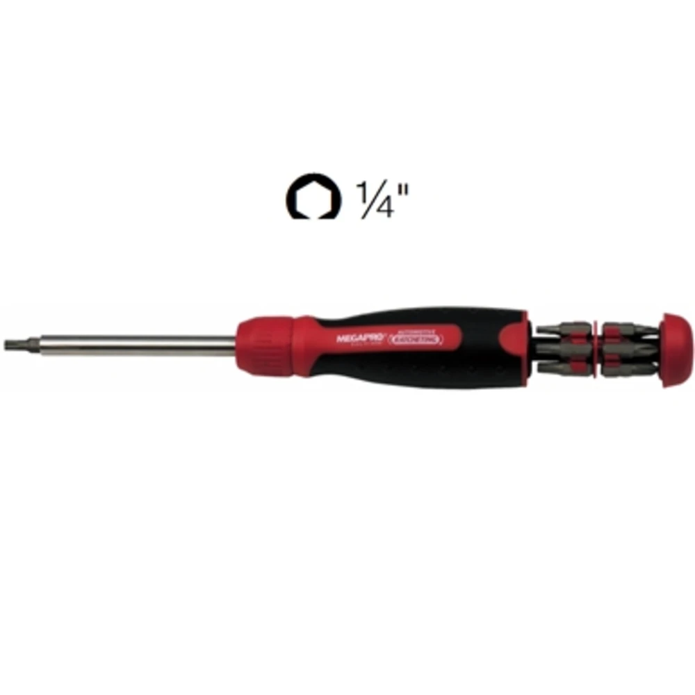A cricchetto reversibile per uso destro, sinistro, fisso MEGAPRO - Impugnatura anatomica in nylon "triax resin" a serbatoio, completa di: 3 inserti per viti con intaglio 3 - 4,5 - 6,5 mm 3 inserti per viti a croce «PHILLIPS» - Punta DIN 1 - 2 - 3 2 inserti per viti a croce «POZIDRIV» - Punta 1 - 2 4 inserti per viti «TORX» - Tx10 - Tx15 - Tx20 - Tx25