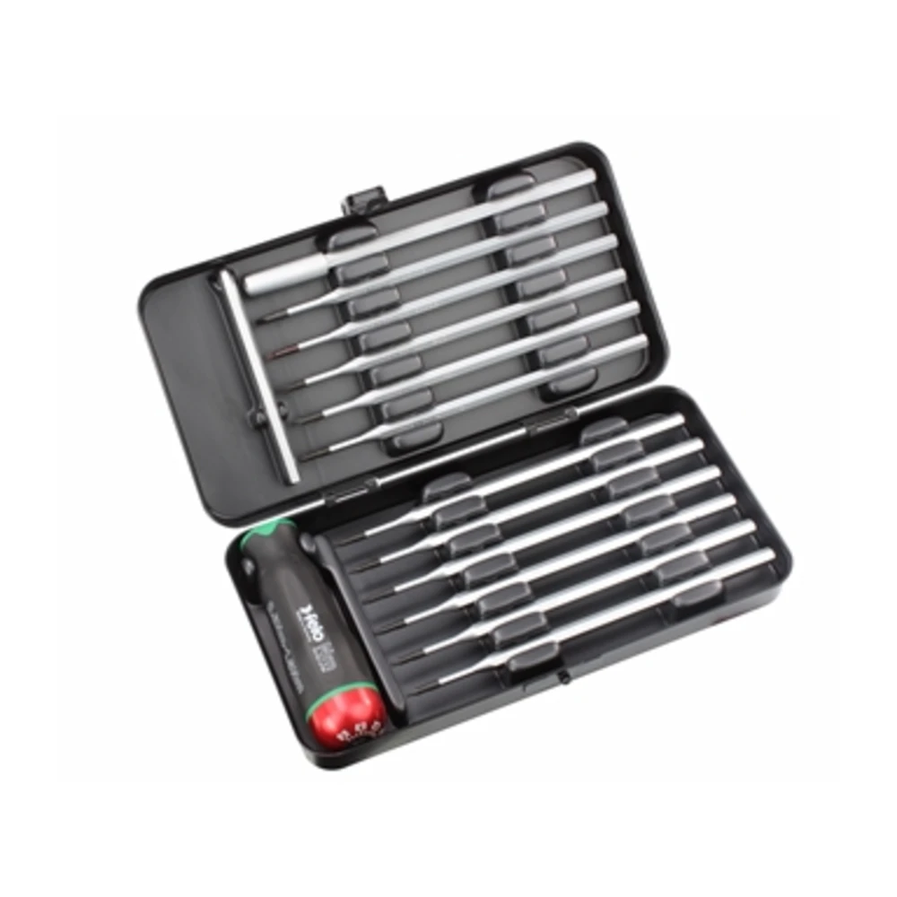Sistema composto da lame intercambiabili da utilizzare con impugnatura di manovra per la regolazione del momento torcente A ricarica automatica, per uso destro Tolleranza su tutti i valori ±6% La regolazione micrometrica del momento torcente si ottiene tramite rotazione della vite sopra l?impugnatura, con l?ausilio di una chiave maschio esagonale (in dotazione) Il raggiungimento del valore prefissato è percettibile all?udito Particolarmente adatti per il serraggio delle viti poste su inserti in metallo duro Assortimenti di lame intercambiabili, composti da: 1 impugnatura di manovra A 2828/2 12 lame intercambiabili come descritto in tabella In cassetta di lamiera verniciata, dimensioni 220x110x35h mm - Peso 1 kg