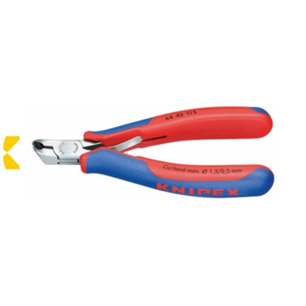 Articolazione passante, precisa, poco soggetta ad usura, di lunga durata Con doppia molla fortemente assemblata, con attrito ridotto - Lavorazione di precisione Nessun rischio di contatto sul circuito dovuto allo stacco di particelle di cromo - DIN ISO 9654 - Esecuzione «Standard» - Manici rivestiti in resina termoplastica colore rosso oppure bicomponenti rosso/blu In acciaio speciale bonificato, forgiato e temperato ad olio Finitura a specchio mediante pulitura finissima In morbida resina sintetica particolarmente gradevole al tatto anche in caso d?impiego continuato - Esecuzione «ESD» - Dissipativa - Manici bicomponenti grigio/nero Esecuzione a dispersione elettrica (dissipativa) - Resistenza superfici >1x10 Ohm <1x10 Ohm In acciaio speciale bonificato, forgiato e temperato ad olio Finitura a specchio mediante pulitura finissima Proteggono i componenti disperdendo in modo adeguato e controllato l?energia elettrostatica - Esecuzione per alte prestazioni - Manici bicomponenti grigio/blu In acciaio al cromo-vanadio per molle, brunite, antiriflesso - Di lunga durata e resistenti all?usura Con cerniera chiusa e vite incassata per effettuare lavori anche in luoghi di difficile accesso Manici maggiorati per un migliore comfort durante l?utilizzo CON TAGLIENTE FRONTALE INCLINATO Lunghezza totale 115 mm - Tagliente corto con piccola sfaccettatura Taglia filo a bassa resistenza Ø 1,5 mm - a media resistenza Ø 1 mm - ad alta resistenza Ø 0,5 mm Esecuzione «Standard» - Manici bicomponenti a forte spessore rosso/blu
