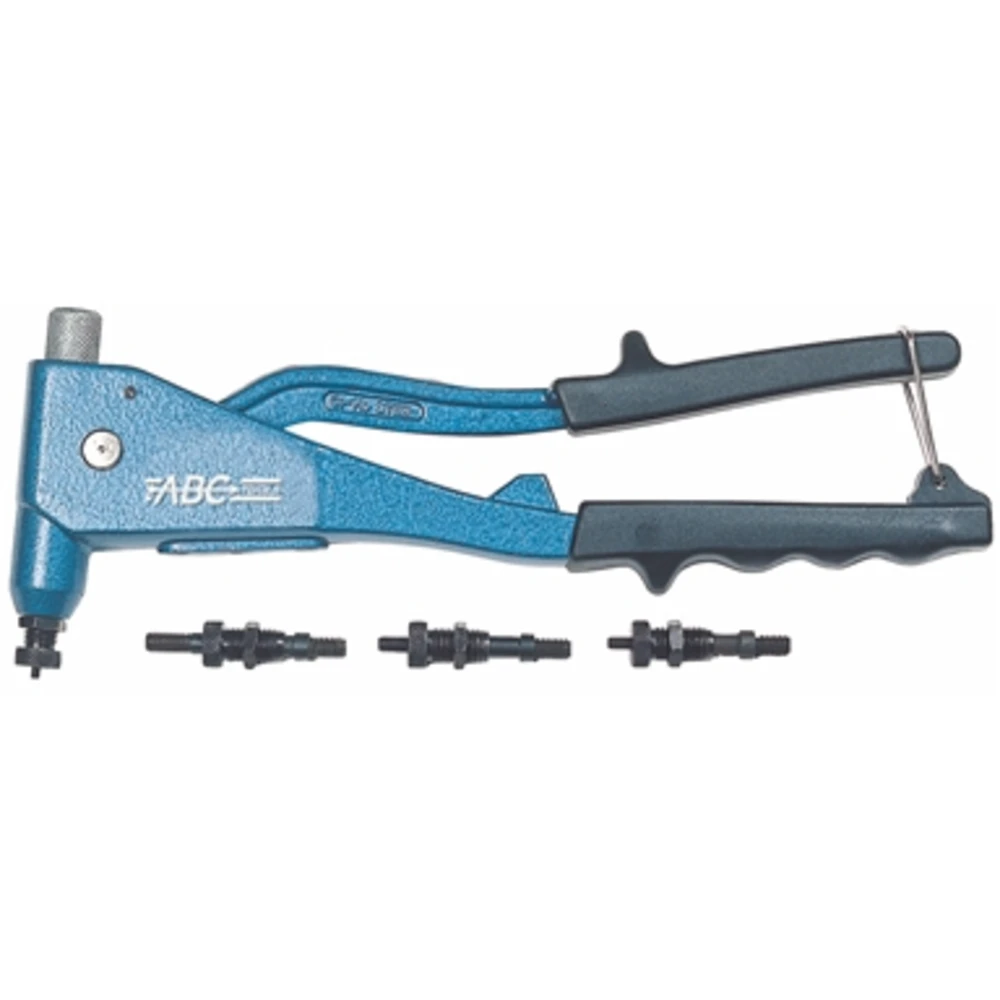 Tipo per l?ancoraggio di bussole filettate Corpo in alluminio pressofuso, leva in lamiera di acciaio Parti soggette ad usura in acciaio di alta qualità - Manici rivestiti in resina termoplastica Per il fissaggio di bussole filettate M3 - M4 - M5 - M6 su spessori da 0,3÷4 mm di qualsiasi materiale Con 4 perni filettati portabussola e 4 ghiere filettate Modo di impiego: si rivetta la bussola (nella filettatura desiderata) con l?ausilio dell?apposito perno, quindi ad operazione ultimata si estrae il perno svitandolo Lunghezza totale 315 mm - Peso 0,6 kg - In valigetta di plastica