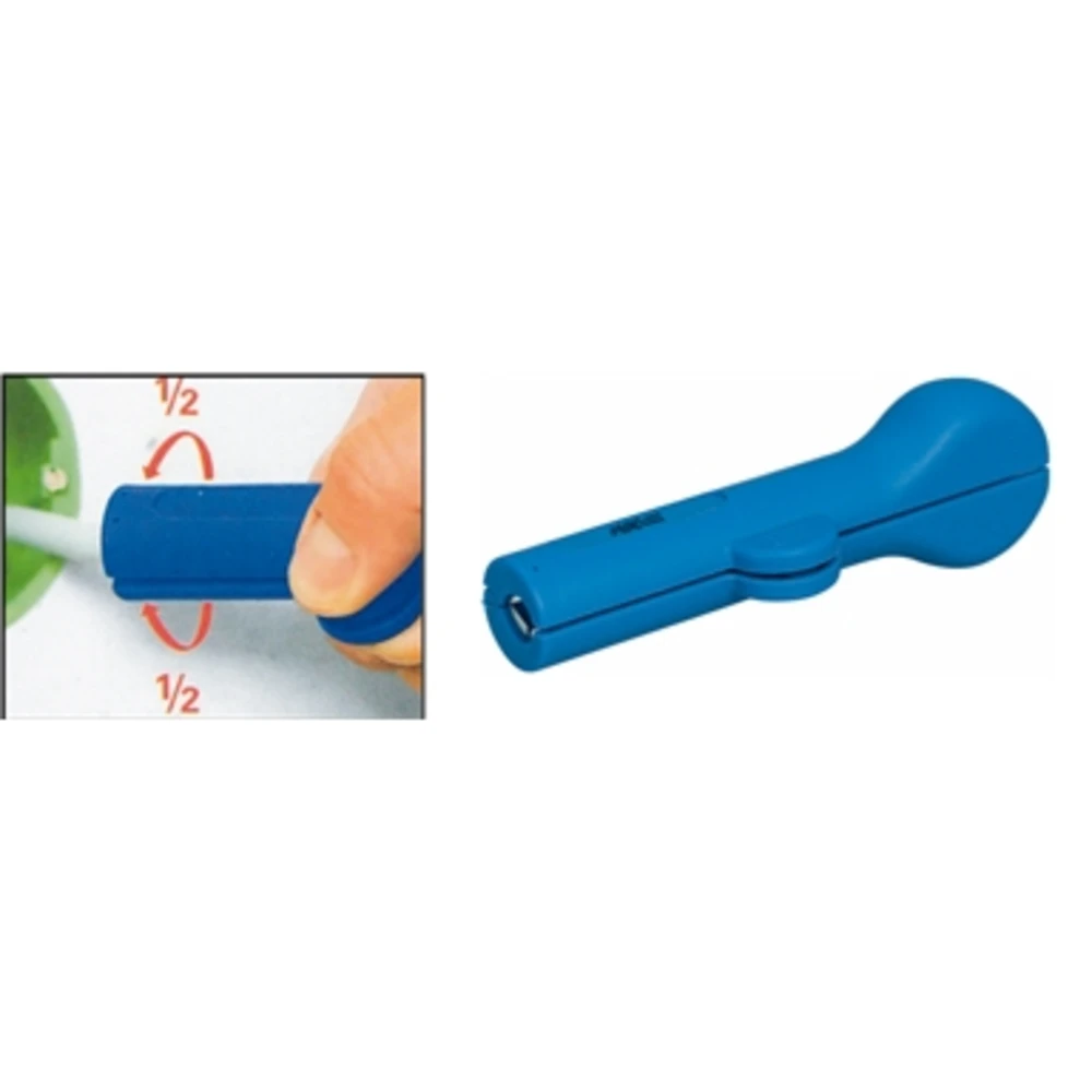 Per sguainare e spelare tutti i comuni cavi a sezione tonda e a prova di umidità con Ø 8÷13 mm (p.es. NYM 3×1,5 mm² e 5×2,5 mm²) Corpo a due semigusci con apertura a cerniera, interamente in materiale plastico, rinforzato con fibra di vetro Particolarmente adatto per impiego in scatole di derivazione e distribuzione Con molla di ritorno e nottolino di arresto Lunghezza totale 125 mm