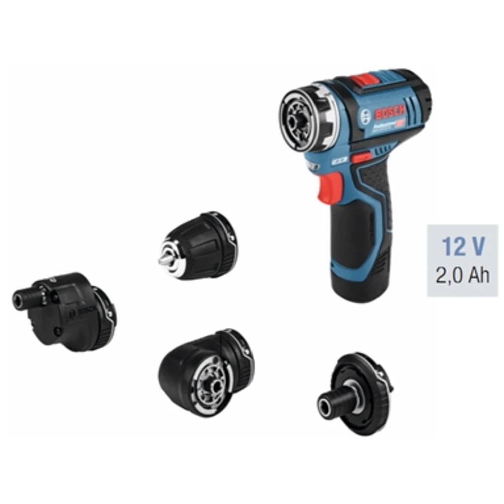 Modello versatile con sistema FlexiClick con 4 teste intercambiabili per 5 diverse possibilità di utilizzo: trapano-avvitatore con portabit magnetico, portabit bloccabile, mandrino, testa angolare portabit decentrato
