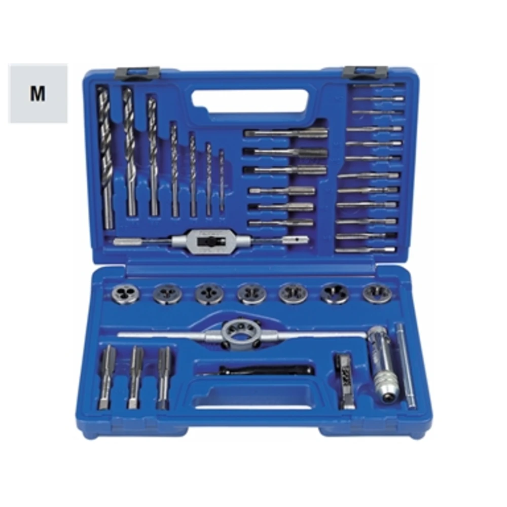 Per filettature Metriche ISO - Passo grosso In acciaio super rapido - HSS Per filettare Ø 3 - 4 - 5 - 6 - 8 - 10 - 12 mm Completa di 1 contafiletti In cassetta di resina termoindurente ad alta resistenza - Dimensioni LxPxh 280x200x60 mm