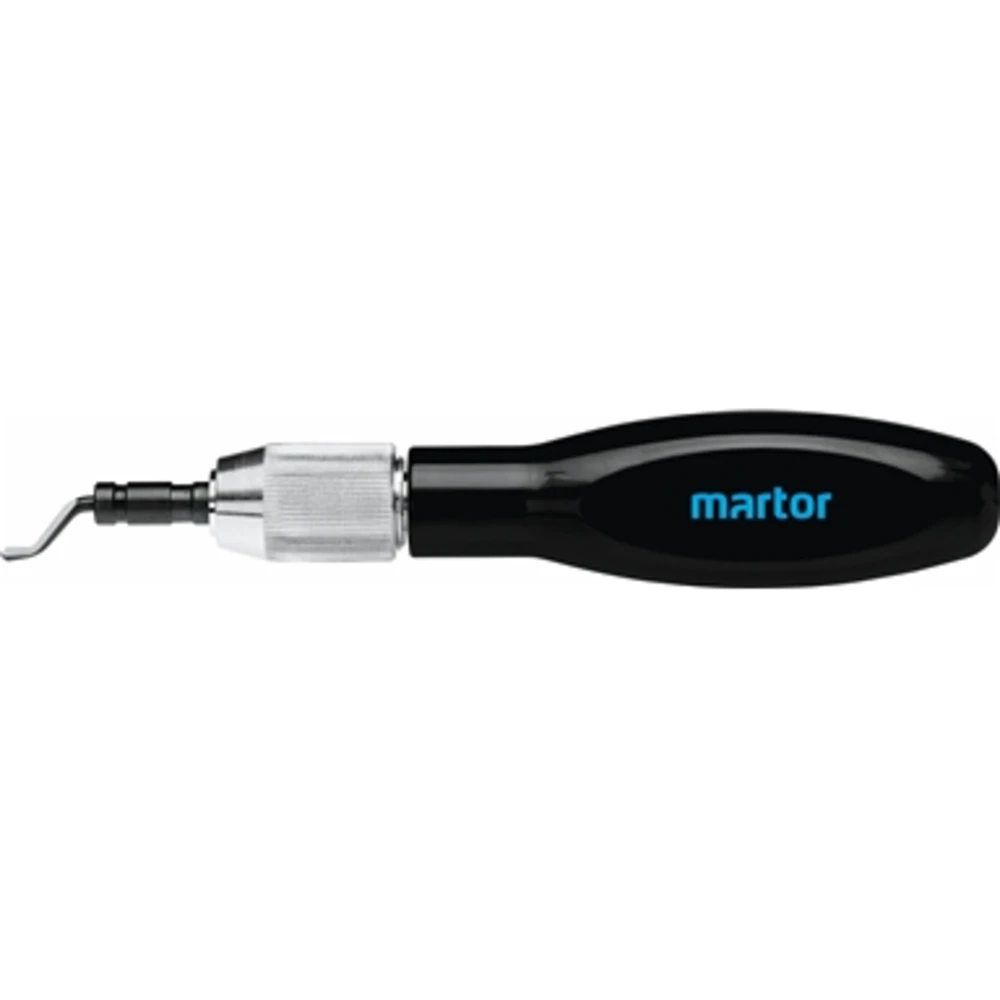 Per sbavare lamiere Mod. CURVEX Impugnatura ergonomica in resina sintetica con serbatoio per contenere le lame, mandrino a vite per il bloccaggio del portalame - Con lama girevole per adeguamento ai profili Portalame reversibile e scorrevole, con innesto a baionetta per lame «MINI» Ø 2,5 mm e «MAXI» Ø 3,2 mm - Completo di 1 lama «MINI» F 8426/5 Ø 2,5 mm - Lunghezza totale 140 mm