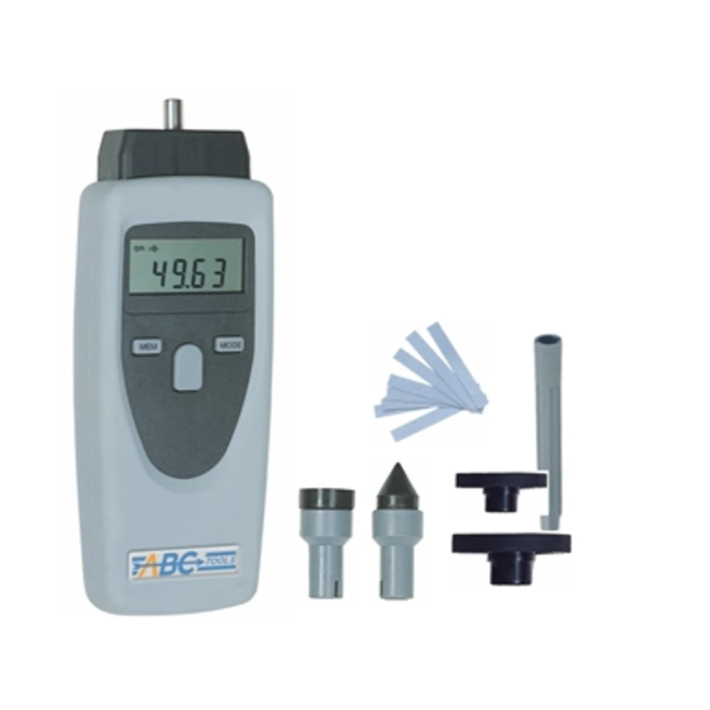 Per rilevare il numero dei giri, senza contatto, mediante un raggio di luce e l?ausilio di un bollino riflettente Tipo a lettura digitale tramite display LCD a 5 cifre Alimentazione con 2 batterie AAA da 1,5V con indicazione dello stato di carica Temperatura di esercizio da -10°C a +50°C Spegnimento automatico dopo circa 30 sec Esecuzione con rilevamento a distanza (mediante un raggio di luce ed un adesivo riflettente) e a contatto tramite un adattatore ad incastro e gli appositi accessori (puntalini o rotelle) Adatto per rilevare anche la velocità e le lunghezze Con funzione MEM per visualizzare l?ultimo valore, il valore max., il valore min. e la media e MODE per selezionare il campo di misura (m/min, m/sec, ft/min, ft/sec, in/min, m, ft, in, rpm) Campo di misurazione per numero dei giri 1,00 ÷ 99999 rpm (ottica) / 0,10 ÷ 19999 rpm (a contatto) Velocità periferica (con rotella da 6?) 0,10 ÷ 1524 m/min / 0,40 ÷ 5000 ft/min / 4,00 ÷ 60000 in/min Misurazioni di lunghezze (con rotella da 6?) 0,00 ÷ 99999 m / 0,00 ÷ 99999 ft / 0,00 ÷ 99999 in Precisione: 0,02% (o 1 digit oppure risoluzione 0,02 m e 1,00 in) Fornito in astuccio completo di: 1 prolunga H 5261/5, 1 rotella Ø 48,4 mm H 5261/6, 1 rotella Ø 31,8 mm H 5261/7, 1 puntalino conico H 5261/8, 1 puntalino convesso H 5261/82, 1 serie di strisce riflettenti H 5261/9