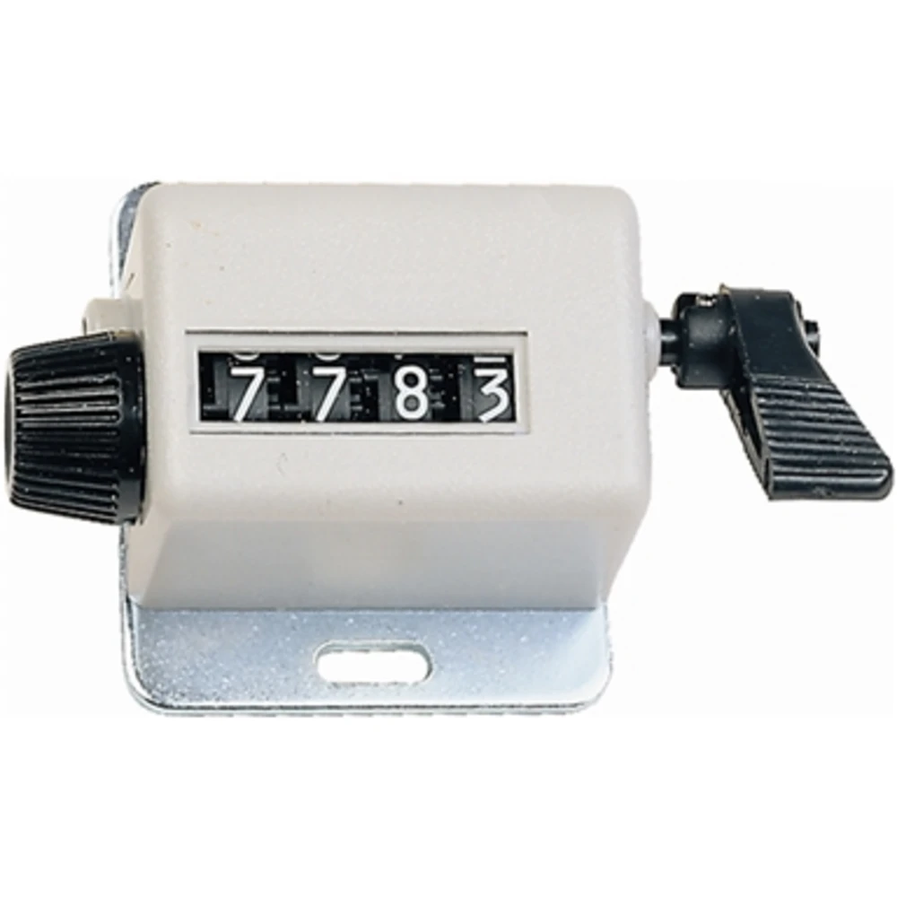 Con pomello zigrinato per il riporto rapido a zero A 4 cifre, altezza 4,5 mm, per contare fino a 9.999 pezzi Tipo rettangolare da tavolo Esecuzione in resina sintetica con base in metallo Con levetta laterale contapezzi Dimensioni 40x45 mm - Altezza 27,5 mm