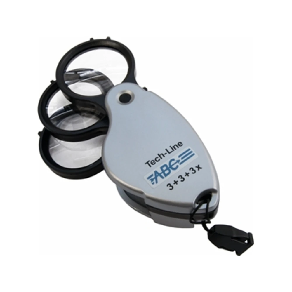 Tipo con custodia in materiale plastico resistente ai graffi Lente aplanatica in vetro silicato Con 3 lenti Ø 30 mm Ingrandimenti: 3x - 3x - 3x (è possibile sovrapporre 2 o 3 lenti per ingrandimenti a 6x e 9x)