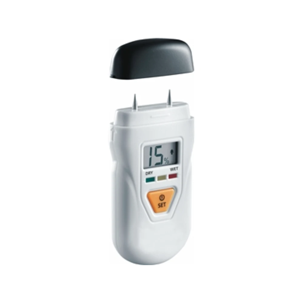 Strumento per verificare il grado di essiccazione del legno, la percentuale di umidità nei materiali da costruzione morbidi Con indicazione della temperatura ambiente in °C o °F e funzione autotest Il livello di umidità/essiccazione è indicato dai 3 LED colorati: verde = asciutto, giallo = umido, rosso = bagnato Campo di misura: legno 6%÷60% - precisione ±2% materiali da costruzione 0,2%÷2,9% - precisione ±0,5% Umidità max. relativa 85% Alimentazione tramite 4 batterie a bottone LR44 da 1,5 V, incluse Dimensioni LxPxh 46x16x85 mm - Peso 41 g Fornito con cappuccio di protezione