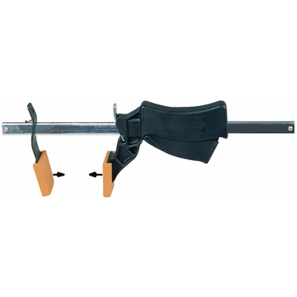 Adatti per serrare o per divaricare rimuovendo la ganascia mobile ed inserendola dal lato opposto Utilizzo semplice, con una sola mano tramite avanzamento a cremagliera, per esercitare forti pressioni, sbloccaggio a leva per l?adattamento rapido al pezzo Corpo in materiale poliammidico rinforzato con fibra di vetro Ganasce con protezione in resina morbida (amovibile), per proteggere parti delicate Tipo con asta in acciaio con bordo zigrinato, nichelata Apertura utile 710 mm Lunghezza utile ganasce 60 mm - Sezione asta 18x6 mm