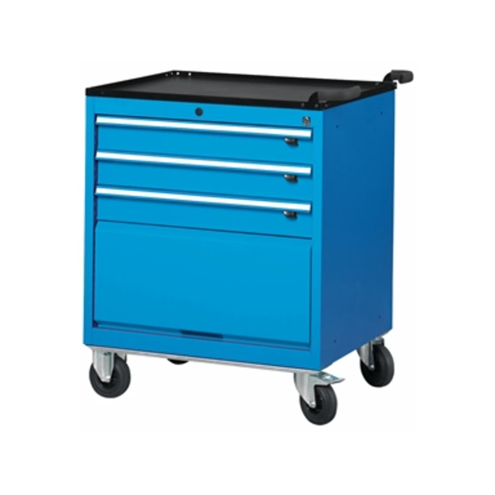 Larghezza 717 mm (790 mm con maniglie) - Profondità 600 mm Cassetti ad estrazione totale con sistema di bloccaggio singolo Piano superiore rivestito con gomma antiolio - Maniglie in acciaio rivestite in gomma antiurto Serratura centrale a cilindro con 2 chiavi in dotazione - Dispositivo di sicurezza antiribaltamento Con 4 ruote in gomma Ø 125 mm di cui 2 girevoli con dispositivo di bloccaggio, montate su cuscinetti a sfera