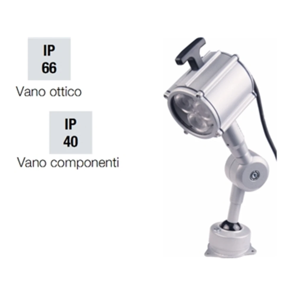 Per illuminazione di posti di lavoro, tecnigrafi, laboratori, scrivanie Distribuzione luminosa ottimale, gradevole, uniforme e senza riflessi Tipo con riflettore in alluminio orientabile di 220° con 3 LED da 7W, Ø esterno 90 mm Vetro in Pirex temprato per proteggere i LED Caratteristiche di illuminazione: 14000 lux a 0,3 m 6000 lux a 0,5 m 3000 lux a 0,7 m Base in alluminio verniciato Ø 60 mm, altezza 30 mm, con 3 fori per fissaggio al banco tramite viti Grado di protezione IP66 per il vano ottico e IP40 per il vano componenti