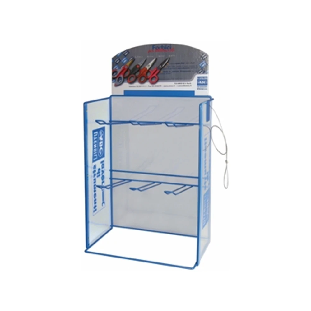 Espositore da banco, vuoto, con pannello informativo double-face e sistema di sicurezza antismarrimento forbici Specifico per blister di forbici per elettricisti Da assortire con min. 48 pezzi a scelta fra: B 2175 forbici in acciaio forgiato B 2175/2 forbici in acciaio forgiato B 2181 forbici INOX, manici in materiale bicomponente B 2182 forbici INOX, manici in materiale bicomponente B 2183 forbici INOX, manici in materiale bicomponente con tacca spelacavi B 2183/5 forbici INOX, manici in materiale bicomponente con tacca spelacavi maggiorata B 2184/2 forbici INOX, manici in materiale bicomponente con lama rivestita al TiN Dimensioni L×P×h 335×220×665 mm