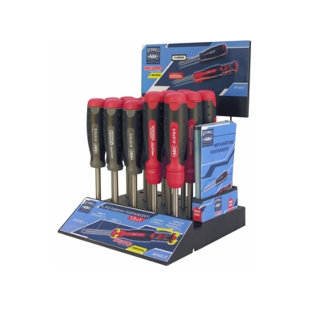 Espositore da banco in plastica resistente e filo d'acciaio Con 2 pannelli informativi frontali e porta depliant sul lato sinistro Completo di 15 impugnature anatomiche «MEGAPRO» in morbida resina sintetica a serbatoio, complete di 12 inserti: - 3 inserti per viti con intaglio 3,0 - 4,5 - 6,5 mm - 3 inserti per viti a croce «PHILLIPS» - Punta DIN 1 - 2 - 3 - 2 inserti per viti a croce «POZIDRIV» - Punta 1 - 2 - 4 inserti per viti «TORX» T10 - T15 - T20 - T25 Con attacco ¼? a tenuta magnetica Lama in acciaio speciale Dimensioni supporto L×P×h 230x230x317 mm