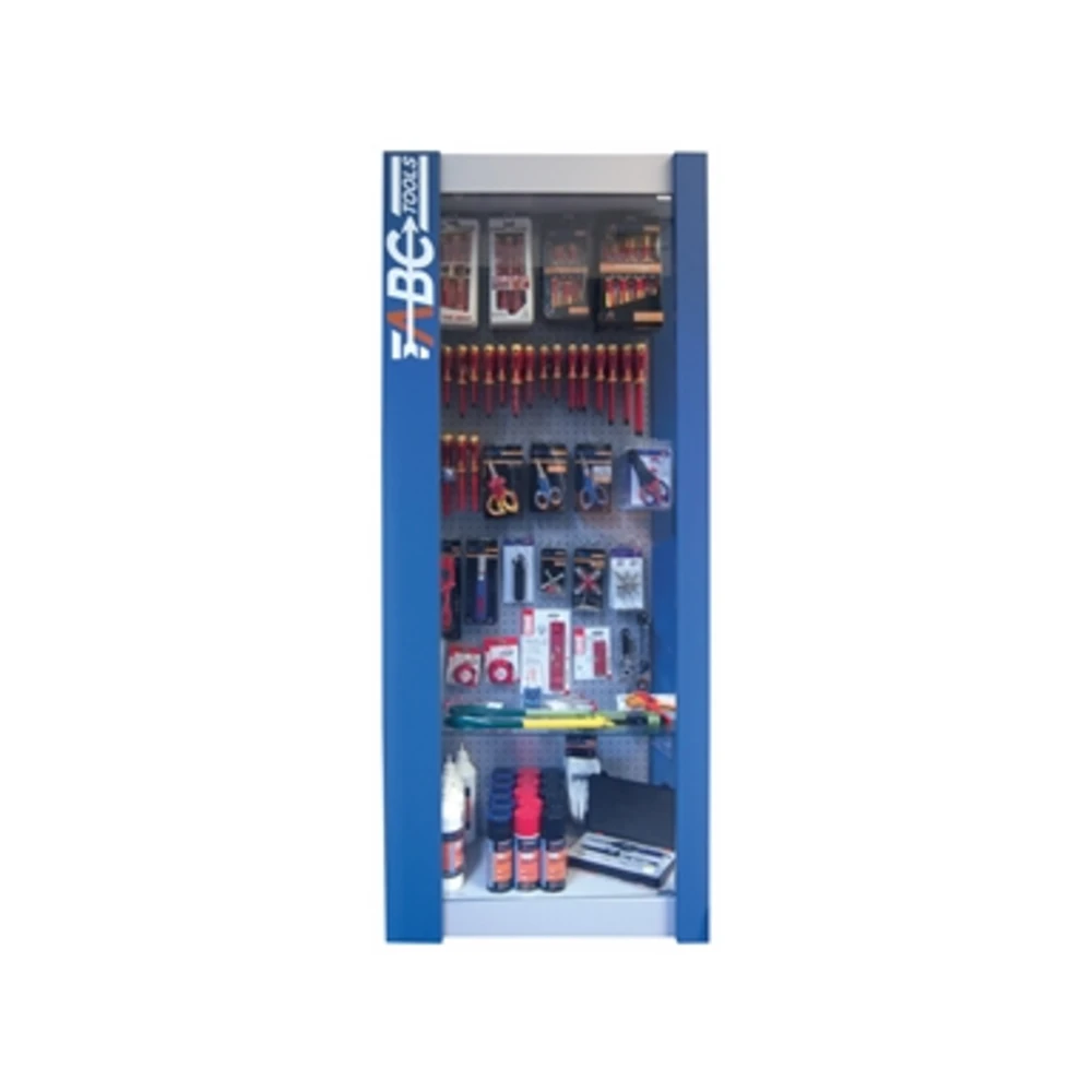 Vetrine per esposizione, con parete posteriore forata per l'applicazione di ganci portautensili Ideali per presentazioni, in show-room, fiere e banchi vendita di assortimenti di utensili o gamme di prodotti in genere Ante in vetro temperato - Serratura con chiusura a chiave