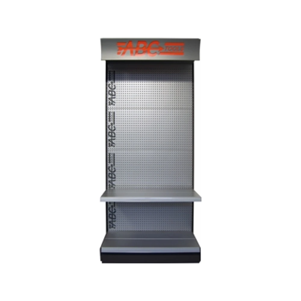 In lamiera di acciaio verniciata Adatto per l'applicazione di diversi tipi di ganci, confezioni e supporti, consente l'esposizione di assortimenti completi e utensili singoli Composto da: 1 plafoniera standard in lamiera con intagliato il logo e completa di luce al neon con spina da 230V 4 pannelli in lamiera, 2 ripiani singoli in metallo 2 piantane e piedini regolabili Dimensioni LxPxh 1000x400x2300 mm Peso espositore vuoto 50 kg Composto da: 1 plafoniera standard in lamiera con intagliato il logo e completa di luce al neon con spina da 230V 4 pannelli in lamiera, 2 ripiani singoli in metallo 2 piantane e piedini regolabili Dimensioni LxPxh 1000x400x2300 mm Peso espositore vuoto 50 kg